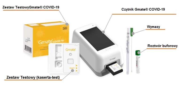 Urządzenie Gmate, które w ciągu 20 minut pokaże czy pacjent jest nosicielem choroby COVID-19. Badanie polega na pobraniu wymazu z nosa lub gardła, wymaz przenosi się na kasetę (specjalny test), który wkłada się do urządzenia. Urządzenie Gmate bada przeciwciała specyficzne dla antygenu wirusa, które są unieruchamiane w badanym obszarze błony testu. Po 20 minutach na wyświetlaczu urządzeniu Gmate można uzyskać wynik testu pozytywny lub negatywny. Dokładność testu wznosi: 93,3%.