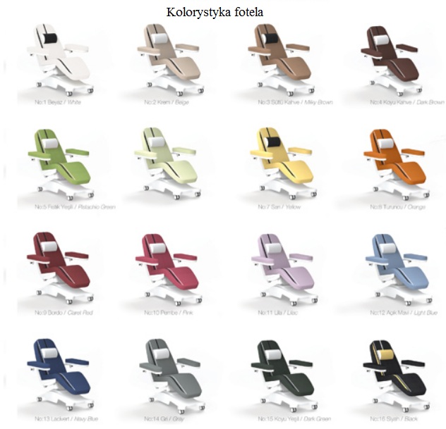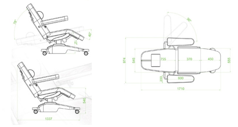 • Regulacja elektryczna: Elektryczna regulacja oparcia pleców (do 78°) i oparcia nóg (do 40°) pozwala na optymalne dopasowanie fotela do potrzeb pacjenta i rodzaju wykonywanego zabiegu.