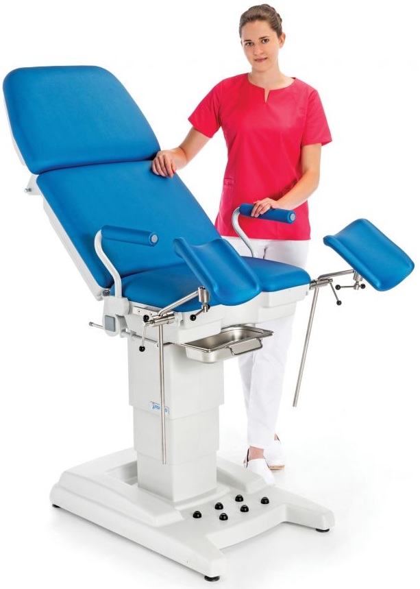 Fotel ginekologiczny FEMI 1.2 - z elektryczną regulacja wysokości, pneumatyczna regulacja segmentu oparcia pleców oraz kąta siedziska. Regulacja wysokości sterowana z wbudowanego w podstawie lub przewodowego. Kąt Trendelenburga wynosi 20 stopni.