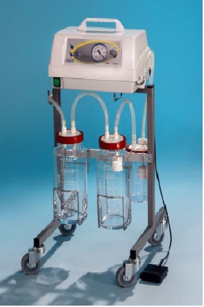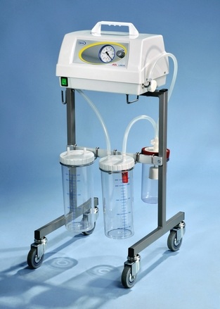 Ssak dwu-butlowy na wózku jezdnym z dodatkowym naczyniem kontrolnym, ssak można sterować z pulpitu (opcja za dopłatą - pedał nożny). Ssak posiada Część aplikacyjna typ CF, która oznacza że można go stosować na operacjach na otwartym sercu i mózgu.