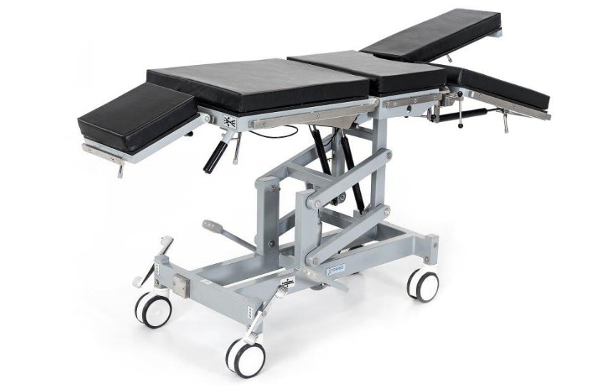 Stół zabiegowy HIPPO FSZ-2 - 4 segmentowy z regulacją blatu za pomocą pompy hydraulicznej sterowana nożnie, regulacja przechyłu wzdłużnego Trendelenburga i Anty-Trendelenburga wspomagane są sprężyną gazową.Ustawienie oparcia pleców, podgłówka oraz podnużka wspomagana spręzyną gazową, wyposażony w koła jezdne z funkcją jazdy kierunkowej i centralnym układem blokowania 4 kół.