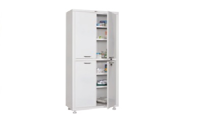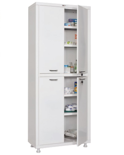 Szafa ze stali, korpus o grubości 0,6 mm natomiast drzwi 0,7 mm. Drzwi szafy zamykana na kluczyk, pełne górne i dolne drzwi szafy wyposażone po 2 półki metalowe z obciążeniem 30 kg na jedną półkę. Szafa osadzona na nóżkach regulowanych 100 mm z regulacją: 95-125 mm. Szafa w kolorze białym malowana farbą proszkową.