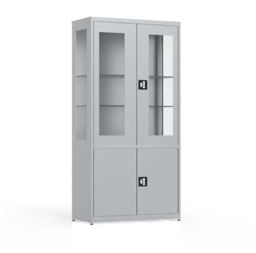 Szafa lekarska dwudrzwiowa, przeszklone górne drzwi i boki MDBW/2s - wykonana z blachy czarnej malowana farbą proszkową na biało. Szafa dwudzielna, część górna posiada przeszklone drzwi i boki natomiast dół zabudowany zamykanymi pełnymi drzwiami uchylnymi. Szafa osadzona na regulowany stopkach posiadająca zamek baskwilowy.