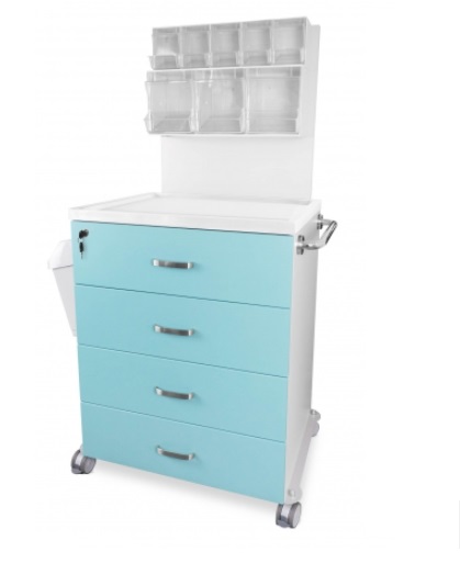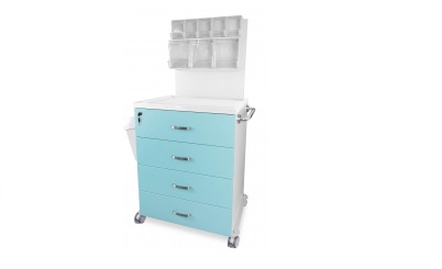 Korpus wózka wykonany z płyty wiórowej natomiast fronty z płyty MDF, całość wózka pokryta jest okleiną PCV. Taca wózka została wykonana ze stali pomalowanej proszkowo. Wózek JWW-A 4 osadzony został na stalowej podstawie który posiada koła jezdne z hamulcem, szuflady wózka zostały wyłożona matą antypoślizgową. Wózek posiada w standardzie dyspenser oraz kosz na odpady.