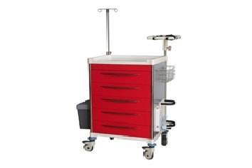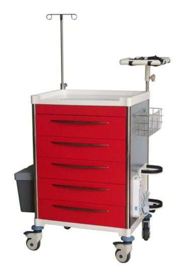 Wózek reanimacyjny JDEQJ „MAGIC” konstrukcja wózka reanimacyjnego oparta na czterech kolumnach wykonanych ze stali nierdzewnej. Płyty boczne i tylna ze stopu aluminiowego.