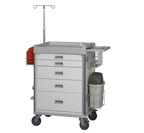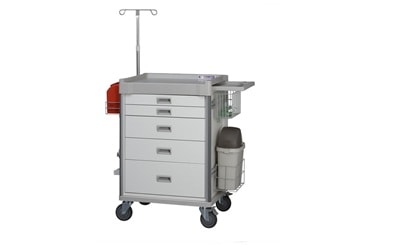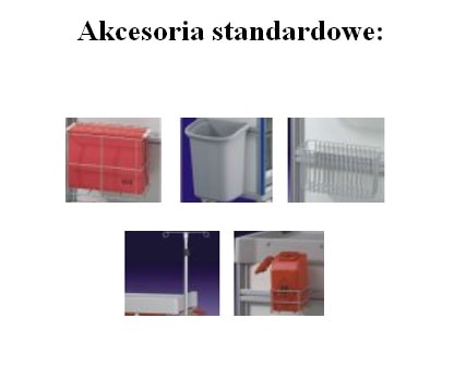 Wózki wielofunkcyjne przeznaczone są na oddziały szpitalne czy gabinety zabiegowe. Wózek wyposażony jest w centralny zamek, boczny blat wysuwany, koła jezdne, kosz na odpady, wieszak kroplówki oraz zamykany kosz na odpady.