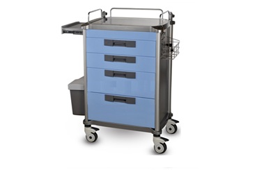 Wózek szpitalny zabiegowy JDEFY (4 szufladowy) BLAT GŁÓWNY ZE STALI NIERDZEWNEJ!!! Wyposażenie: dodatkowy wysuwany blat roboczy z boku wózka, dwa plastikowe kosze na odpady, szuflady zamykane na centralny zamek,