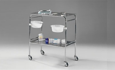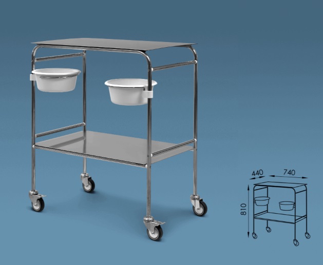 Stolik zabiegowy SM-35 - wykonany z rurek stalowych pokryte powłoko niklowo-chromową, posiada dwa blaty ze stali nierdzewnej oraz dwie miski z tworzywa. Wózek osadzony na czterech kółkach jezdnych pozwalający w przemieszczeniu wózka.