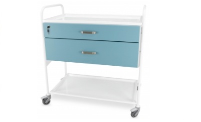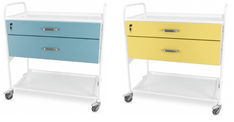 Wózek wyposażony w tace ze stali pokrytej farbą proszkową oraz korpus wykonany z płyty wiórowej, a fronty wózka z płyty MDF. Wózek pokryty okleiną z PCV. Podstawa wózka osadzona na stalowej podstawie z kołami jezdnymi z hamulcem. Wózek wyposażony w dwie szuflady oraz matę antypoślizgową włożoną w szuflady.