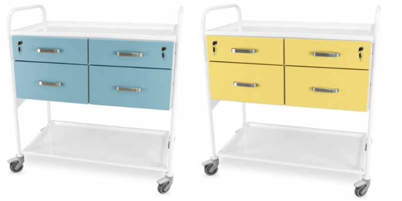 wózek wyposażony w tace ze stali pokrytej farbą proszkową oraz korpus wykonany z płyty wiórowej, a fronty wózka z płyty MDF. Wózek pokryty okleiną z PCV. Podstawa wózka osadzona na stalowej podstawie z kołami jezdnymi z hamulcem. Wózek wyposażony w cztery szuflady oraz matę antypoślizgową włożoną w szuflady.