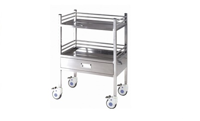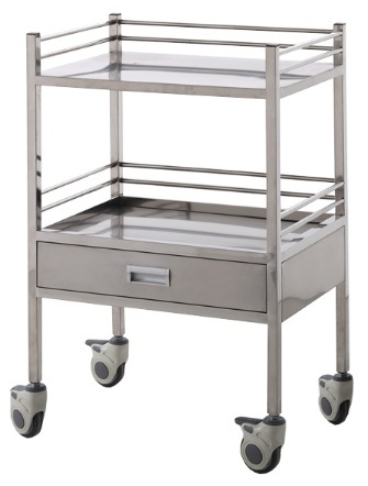 Posiada dwa blaty, oba zabezpieczone relingami przed zsuwaniem się przedmiotów. Pod dolnym blatem szuflada, także ze stali nierdzewnej. Stolik wyposażony w 4 koła o średnicy 100 mm, w tym  2 z nich z blokadami indywidualnymi.