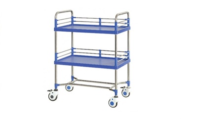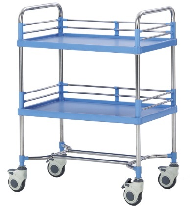 Stolik zabiegowy F-47 - Konstrukcja wózka wykonana z chromowanych rur stalowych, osłonki z tworzywa ABS, blaty również z ABS w kolorze niebieskim. Wózek posiada dwa blaty, oba z trzech stron posiadające relingi zabezpieczające przed zsuwaniem się przedmiotów z blatów podczas przemieszczania się wózka zabiegowego. Stolik wyposażony w 4 koła o średnicy 100mm, każde z blokadą indywidualną. Ładowność wózka: do 100kg. Wózek wyposażony w odbojniki w każdym narożniku zabezpieczające wózek i ściany przed obiciami.